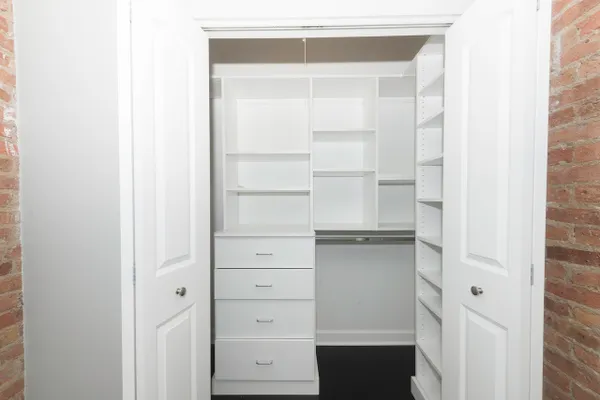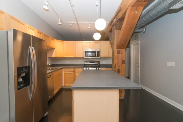 Brick and timber loft in the highly sought after River North Commons with impressive 14' ceilings, large windows. Open kitchen with stainless steel appliances, combination living / dining area and cozy balcony on a quiet tree-lined street. Washer dryer is one year old, Central Air and furnace is one years old. River North Commons is conveniently located walking distance to public transportation, Ward Park, East Bank Club, Erie Cafe, the Riverwalk, dog park and easy access to the expressway. 24-hour door staff and fitness center, additional storage locker. Deeded Parking $25,000