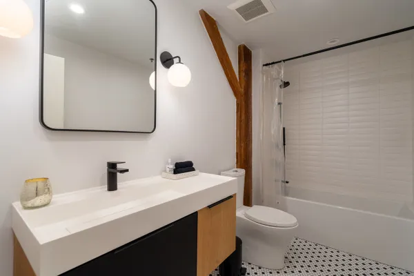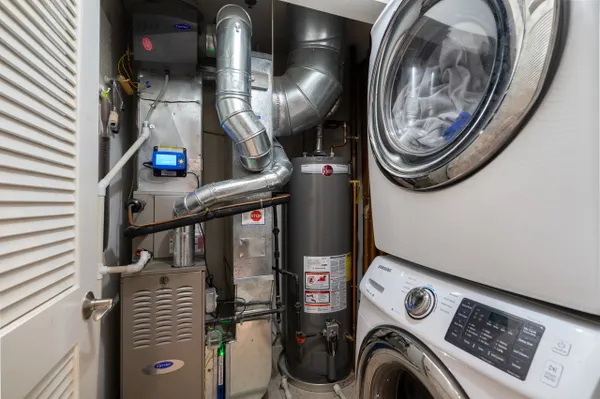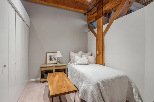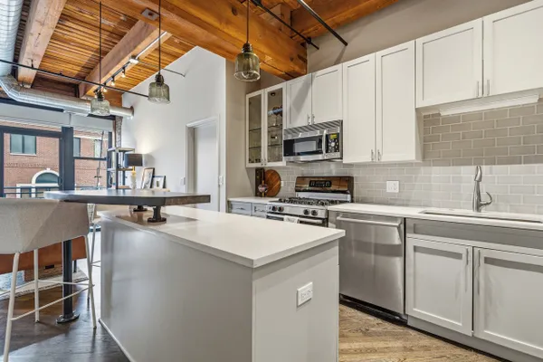 An extraordinary extra-wide split two-bedroom, two-bath loft showcasing exposed brick and timber beams, soaring ceiling heights, and a truly open, airy feel throughout. The beautifully renovated kitchen is a showstopper, featuring crisp white cabinetry, Bianco quartz countertops, a cool gray subway tile backsplash with modern rectangular detailing, an extra-deep sink, stainless steel appliances, garbage disposal, and eye-catching decorative lighting. A large island offers an elevated wood-slab breakfast bar, perfect for both casual dining and entertaining. The expansive living and dining area is anchored by a sleek gas ventless fireplace, wall mounted TV that will stay and is enhanced by a custom eight-foot built-in buffet with granite top, wine refrigerator, and abundant storage. Retreat to the oversized primary suite, easily accommodating a California king bed, with professionally organized double closets leading to a newly renovated spa-inspired bath featuring an oversized rain shower and double vanity. A generously sized second bedroom is complemented by a stylishly updated second bath. Additional highlights include in-unit laundry, a large private balcony with gas hookup for grilling and ample seating, and one secured parking space-an exceptional loft offering both sophistication and comfort in every detail. New window treatments with black-out shades, Refinished floors (2019), Upgraded lighting, New AC (2021), New water heater (2021), Both bathroom renovations (2023). The premier full-amenity building includes 24-hour door staff, on-site management, a newly renovated fitness center, attached garage, pet-friendly policy, additional storage units, and a common rooftop deck with sweeping skyline views. Prime oversized deeded garage parking available for $20k. Exceptional location offers a true neighborhood feel in the heart of the city-steps from the Riverwalk, Montgomery Ward Park, East Bank Club, top restaurants, boutiques, and easy access to 90/94. An impeccable home in an unbeatable River North pocket. Simply move in and enjoy!